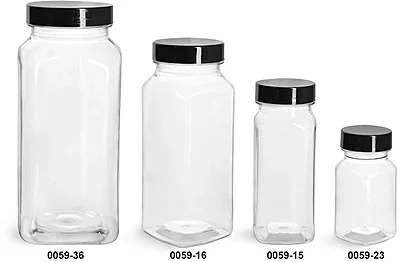 Plastic Bottles, Clear PET Square Bottles w/ Black Smooth Plastic Lined Caps