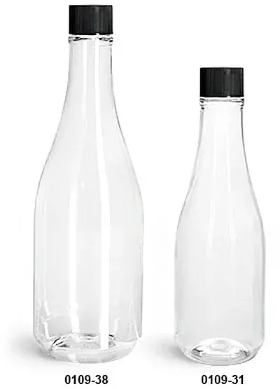 Plastic Bottles, Clear PET Woozy Bottles w/ Black Ribbed Lined Caps & Orifice Reducers