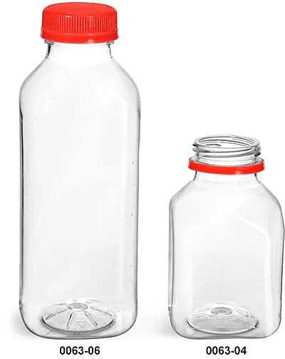 Plastic Bottles, Clear PET Square Beverage Bottles w/ Red Tamper Evident Caps