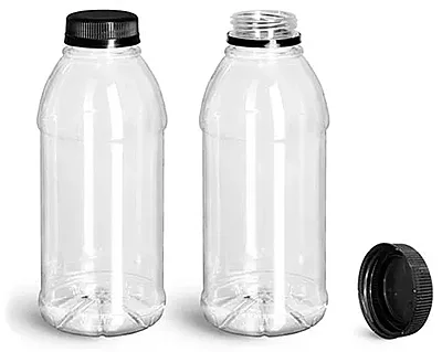Plastic Bottles, Clear PET Beverage Bottles w/ Black Polypro Tamper Evident Caps