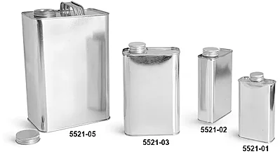 Oblong tin cans in each size include matching metal screw caps and seals for securely closing these metal tins during storage. The durable construction allows these tin cans to be used for a range of industrial materials that could include paint thinner and motor oil. The oblong shape of the tin cans provide labeling panels to include all of your product information needed for safe and effective use.