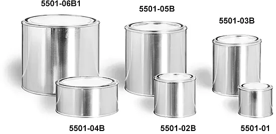 In a variety of sizes, these round paint style tin cans can be a packaging choice for a range of industries. The matching metal lids seal the tin cans for shipping to customers and storing with care. These tin cans could package candles and bath salts for creative gifts, or to securely store industrial cleaners and paints.