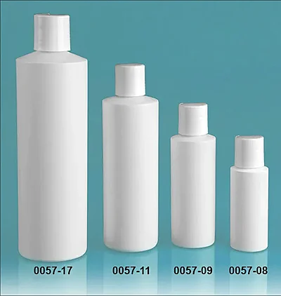 Plastic Bottles, White HDPE Cylinder Bottles w/ White Disc Top Caps
