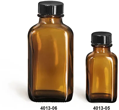 Glass Bottles, Amber Glass Oblong Bottles w/ Black Ribbed Phenolic Cone Lined Caps