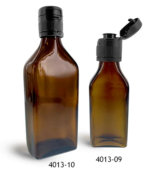 Glass Bottles, Amber Glass Oblong Flasks w/ Black Tamper Evident Snap Top Dispensing Caps