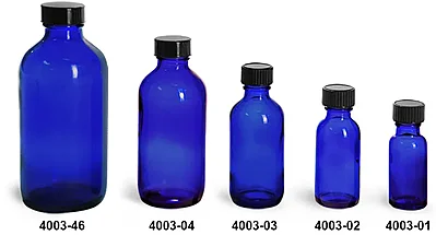 Glass Bottles, Blue Glass Boston Round Bottles w/ Black Phenolic Cone Lined Caps