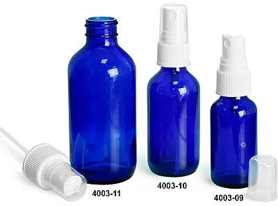 Ranging in size from 1 oz to 4 oz, the blue glass boston round bottles are available with white ribbed polypropylene fine mist sprayers. The fine mist sprayers come topped with clear styrene protective hoods. The blue bottles with fine mist sprayers make an excellent choice for containing products that need to be applied by misting.