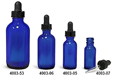 Blue Glass Bottles, Boston Round Bottles with Black Droppers