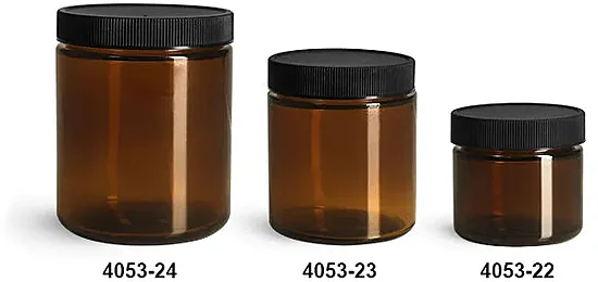 Glass Jars, Amber Glass Straight Sided Jars w/ Black Ribbed PE Lined Caps