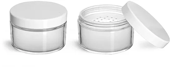 Plastic Jars, Clear Polystyrene Jars w/ White Caps and Powder Sifter Inserts
