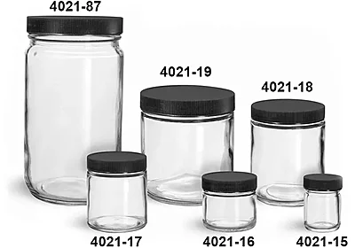 These clear glass straight sided jars are available in a wide range of sizes and come with PE lined black ribbed plastic caps. Consider using these glass jars to package a variety of cosmetic or bath and body care products.