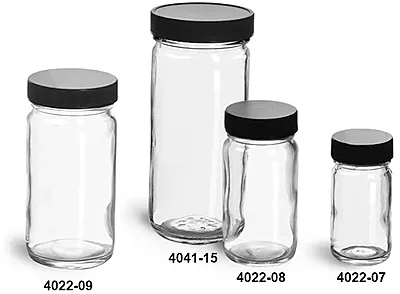 Clear Glass Jars, Clear Glass Paragon Jars w/  Lined Black Ribbed Plastic Caps