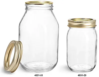 Clear Glass Jars, Clear Glass Mayo/Economy Jars w/ Gold Two Piece Canning Lids