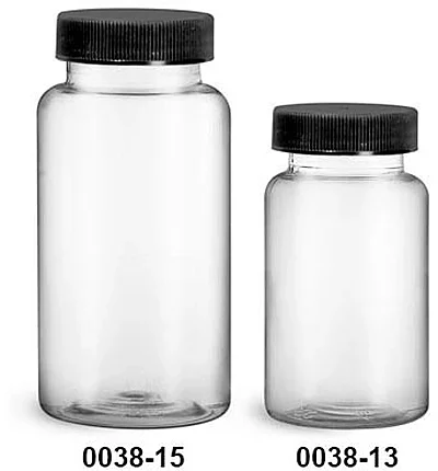 Plastic Bottles, Clear PET Wide Mouth Packer Bottles w/ Black Ribbed PE Lined Caps