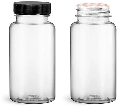 Plastic Bottles, Clear PET Wide Mouth Packer Bottles w/ Black Ribbed Induction Lined Caps