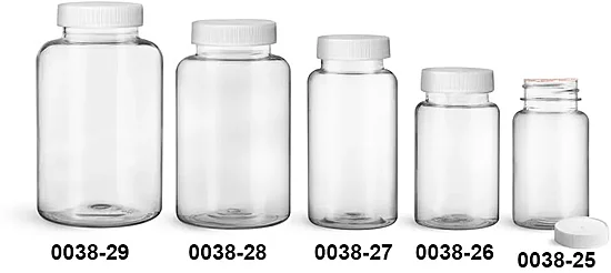 Plastic Bottles, Clear PET Wide Mouth Packer Bottles w/ White Ribbed Induction Lined Caps