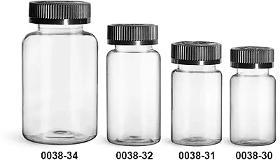 Plastic Bottles, Clear PET Wide Mouth Packer Bottles w/ Black Child Resistant Caps