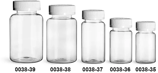 Plastic Bottles, Clear PET Wide Mouth Packer Bottles w/ White Child Resistant Caps