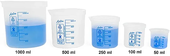 The plastic polypropylene beakers are reusable and have blue graduations that assist in making legible and efficient measurements. Each kit comes with 1 of each specifically sized beaker. You can view which plastic beakers are included in this kit above. These beakers feature a vertical lip around the top of the beaker which helps contain spills and allows the polypropylene beakers to be stacked together when not in use. The pour spot on the lip of the plastic beakers helps direct the flow of your products when pouring.