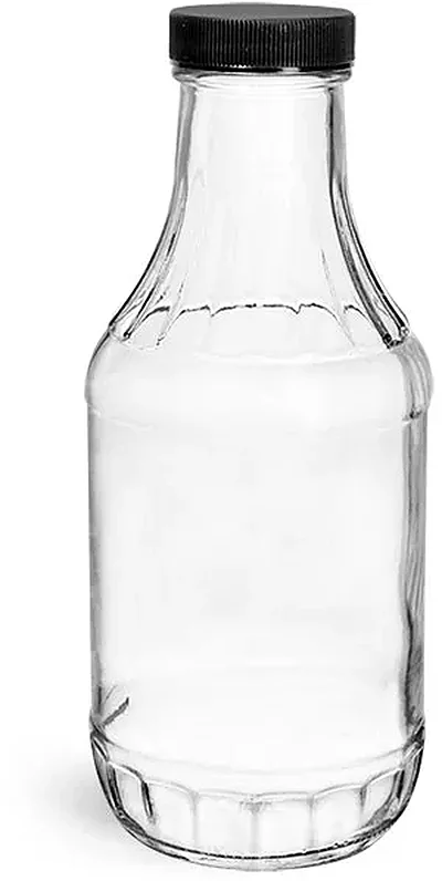 Glass Bottles, 16 oz Clear Glass Sauce Decanter Bottles w/ Ribbed Black Lined Caps
