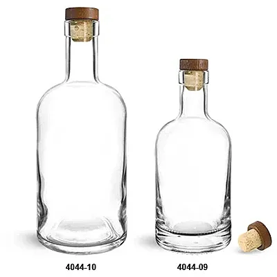 Clear glass bar top bottles with stained wood bar tops and natural corks nicely showcase products while also extending their shelf life. Wood bar tops with natural corks create a snug fit which reduces oxidation and helps to maintain product freshness. The high clarity of the glass bar top bottles helps products such as whiskey, rum, and other liquors display vibrantly on store shelves.