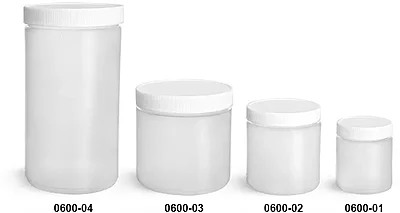 The natural HDPE straight sided jars come in four convenient sizes, 4 oz, 8 oz, 16 oz, and 32 oz. These plastic jars come topped with white polypropylene ribbed PE lined closures and are sold in case packs of 12 or 24 pieces.