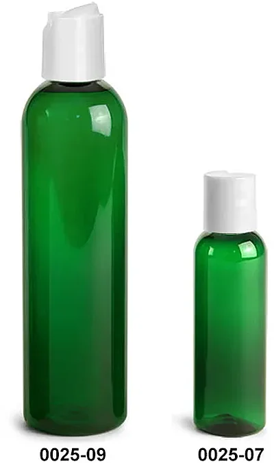 PET Plastic Bottles, Green Cosmo Round Bottles w/ White Disc Top Caps