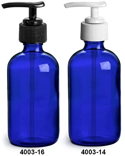 Glass Bottles, Blue Glass Boston Round Bottles w/ Lotion Pumps