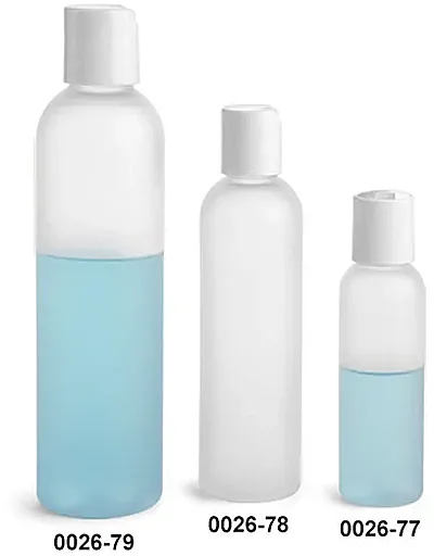 These frosted PET cosmo round bottles are available in a range of sizes and come with matching white polypropylene disc top caps. These caps allow for the convenient dispensing of a small amount of product when light pressure is applied. These plastic bottles with disc top caps may be suitable for packaging a variety of bath and body products including lotions and hair care products. Make sure to test your products with the container/cap beforehand to ensure proper compatibility.