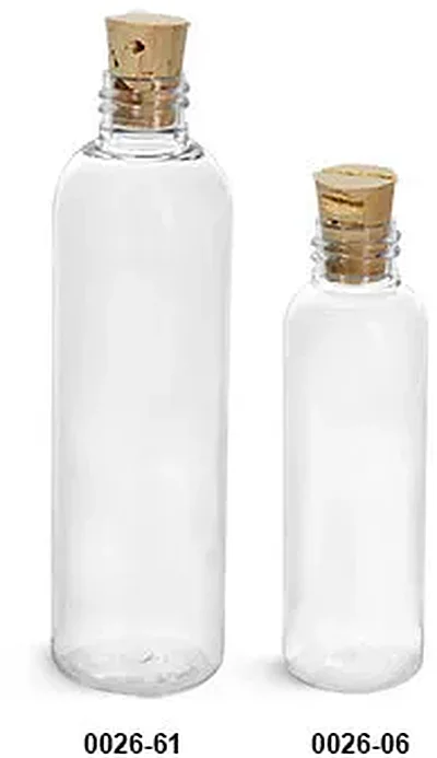 These clear PET cosmo round bottles are available with tapered cork stoppers. Simply push the corks halfway into the opening of the bottle for a good fit. These plastic bottles could be ideal for a variety of solid, dry products. It may be difficult to get a good seal when using with liquids and we recommend testing with your product for compatibility.