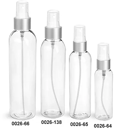 Plastic Bottles, Clear PET Cosmo Round Bottles w/ White Fine Mist Sprayers w/ Brushed Aluminum Collars