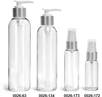 Each clear cosmo round bottle size is paired with .4 ml white treatment pumps or 2 cc white lotion pumps with silver brushed aluminum collars. The clear PET plastic bottles allow product to be clearly displayed. The lotion pumps dispense high viscosity product, making these plastic bottles a possible packaging choice for hand lotion, serums, or other skin care products.