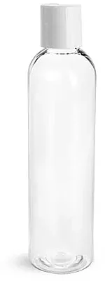 PET Plastic Bottles, Clear Cosmo Round Bottles w/ White Induction Lined Disc Top Caps