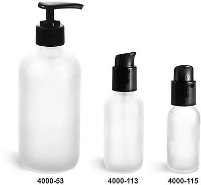 Glass Bottles, Frosted Glass Boston Round Bottles w/ Black Pumps