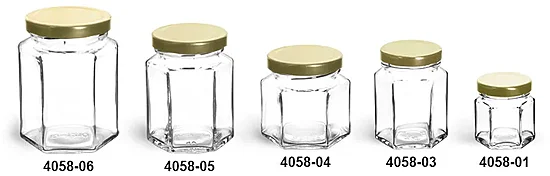 Clear Glass Jars, Clear Glass Hexagon Jars w/ Gold Lug Caps