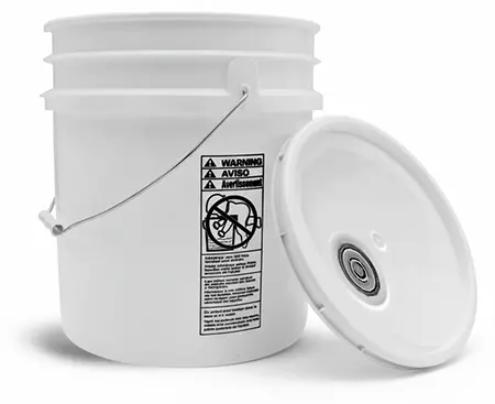 5 gal w/ Rieke Lid White HDPE Pails w/ Metal Handles, Safety Warning & Lids w/ Rieke Fitting